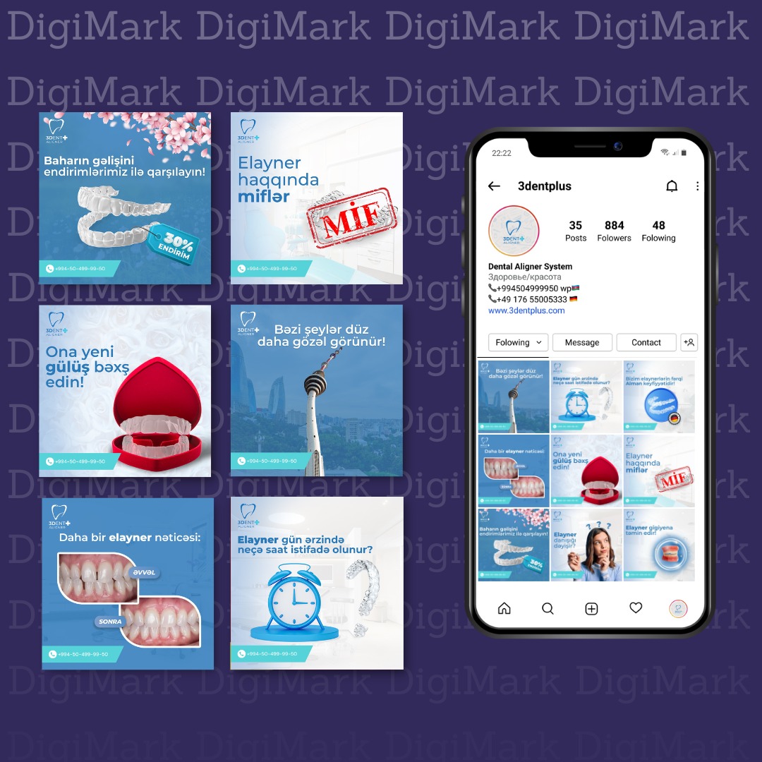 3dent+ Aligners müasir texnologiya ilə diş komplekslərinizi yox edir! 2023-cü ildən etibarən başlayan əməkdaşlığımız müddətində səhifədə strategiyanın yaradılması və müvafiq kontentlərin yazılması ilə bağlı işlər gördük. Həmçinin həm Almaniya, həm də Azərbaycanda olan pasientlər üçün müxtəlif dillərdə məlumatlandırıcı çap işləri də təhvil verilib.